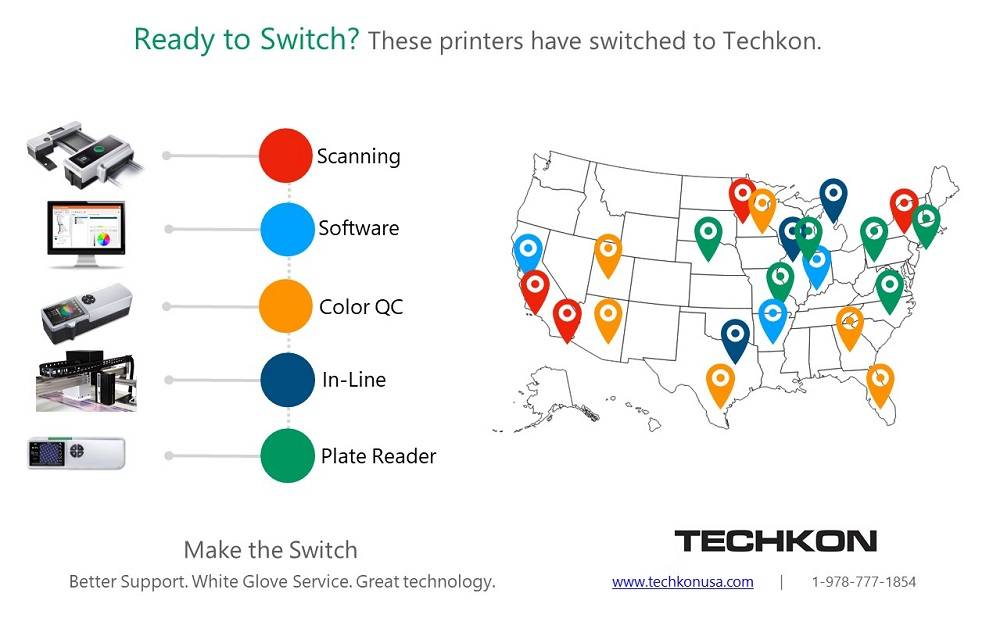 The ‘Make the Switch’ program was born out of the idea that the process of integrating new color measurement solutions should be seamless. In order to help customers through the process of integration, Techkon appointed a small dedicated team with extensive experience in training and support, to carefully guide customers through the process of implementation. In many cases, the implementation includes: color data audit and management, process analysis, staff training, and ongoing virtual technical support. The comprehensive approach to integration has been applauded by color related staff in printing and packaging companies across North America.