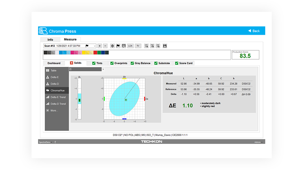 ChromaQA SUITE is designed for spot colors, 4C process work, ECG jobs, and tracking G7 compliance. In addition, job reporting, data query, and customized score cards provide visibility for external brand customers, internal quality managers, and continuous process improvements.