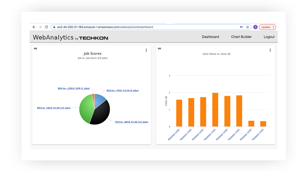 | Web-based reporting that produces line, bar, and pie charts of color data across multiple jobs | |||||||||||