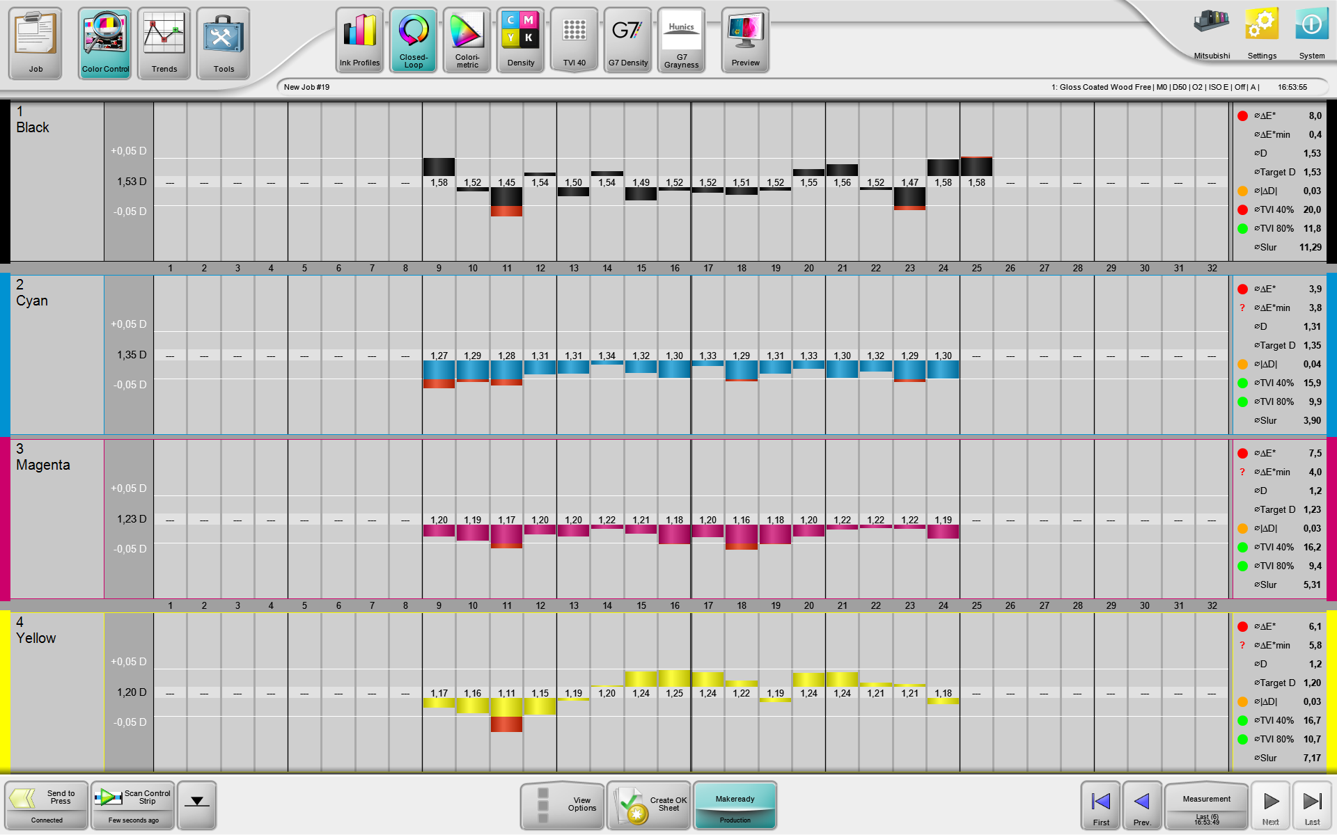 PressLink software allows the user to browse a list of jobs that have been converted and are ready to run on press. Upon selecting one, the user will assign and specify things such as colors in each press unit, if the job is perfecting or not, etc. Next, the user simply selects the substrate that they will be using and the PC analyzes the input data, combines it with the pre-configured settings for density or Lab targets, and computes the appropriate ink key and sweep positions (sweeps on most presses). This ink key information is then automatically sent to the console. Typically, an operator will then just need to confirm these ink key changes at the console before the actual changes are made. Just another note, for all press types, the software only sets the ink sweeps during the initial ink-presetting. Therefore, if further changes to the ink sweeps are required, the operator would make these changes manually.