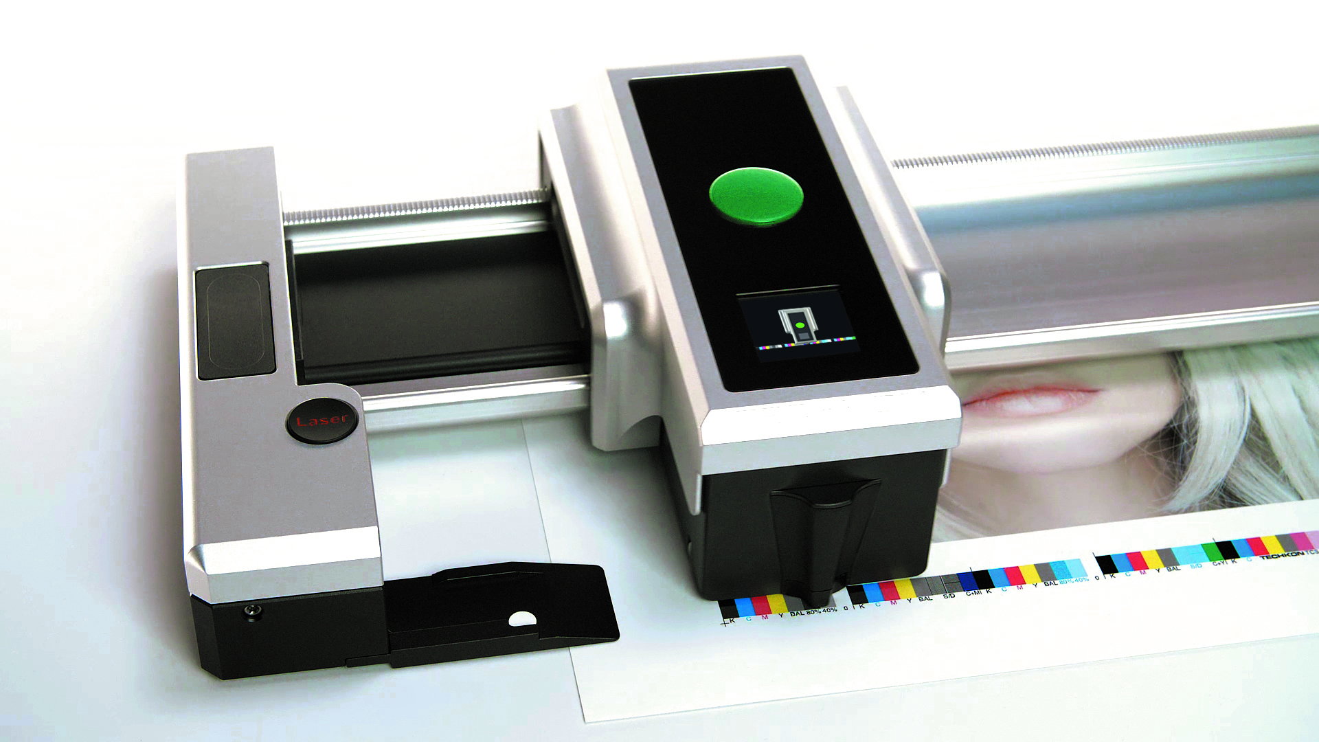 At this point, we now have ink on paper, the registration is close, and it is time to start scanning sheets to determine what specific ink key adjustments are needed. This brings us to the next piece of hardware that is required, the Techkon SpectroDrive. Typically, we mount this on the console directly above the ink key display which allows the press operator a seamless view of what is happening on press. As an alternative, we can also mount the SpectroDrive on separate tables if that is preferred by the customer. In some cases, the console top is not designed or sized to accommodate the scanner. Therefore, in such cases, we typically mount a sheet of melamine over the console top to expand the length of the top to better accommodate the scanner. In reality, any smooth uniform white or black, cleanable, surface will do just fine. To start the scanning process, the press operator pulls a sheet and lays it down on the console or table. Next, the operator starts the scan by just pressing the big green button on top of the SpectroDrive or by touching the scan icon on the screen. The SpectroDrive measurement head then immediately scans accross the sheet measuring the color bar and returns to its’ home position after the scan.