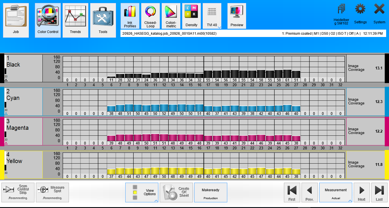 When the scan is done, the results are displayed on screen so the operator can then review the suggested ink key changes. Then, with the press of button, the operator simply sends the corrections to the console/press (or they make additional manual adjustments if they like). At this point, the ink keys will either open or close as needed based on the scan, results, and calculated corrections. Another noteworthy point, similar to the ink-presetting point made earlier, is that the closed-loop portion of this system ONLY ever adjusts the ink keys. Therefore, if the blankets are worn, or if impression cylinders are old or not aligned, or if the water balance is not correct, there is nothing that the closed-loop system can do about those issues. Often times on an installation, we will see in a matter of hours just how well or poorly a press has been maintained and this ends up having a huge impact on the effectiveness of the ink presetting and closed-loop automation process.