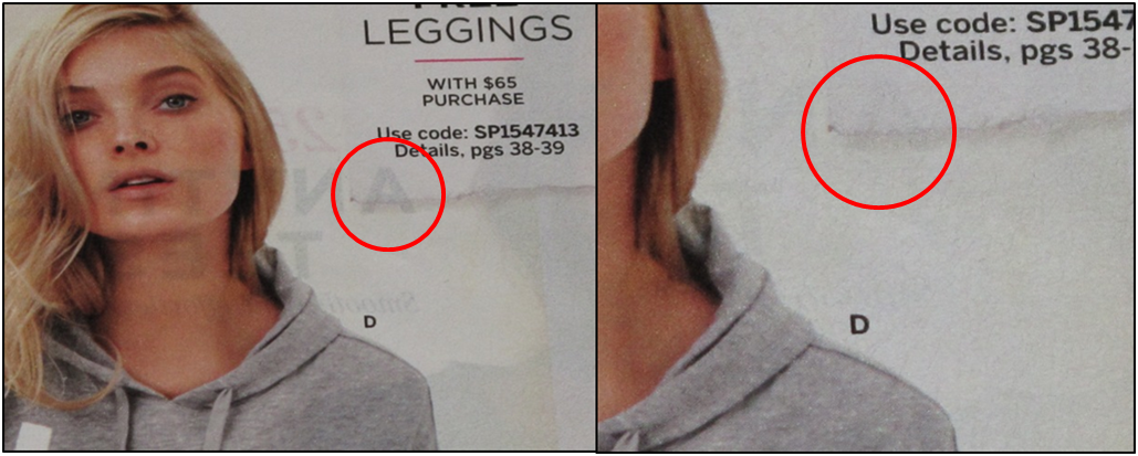 In the picture below, a page from a catalog was placed on top of a white backing (on the left), and a black backing (on the right). The backing material not only has an effect on color, but also can enhance or prevent show-through from the other side. This is true for light-weight stocks and can be huge for translucent or transparent films.