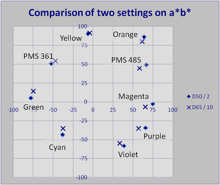 | Observer | 2° or 10° | The ISO standards for the graphic arts require a D50 illuminant and the 2° observer, but various other combinations, such as D65/10°, are commonly specified in the packaging industry. |