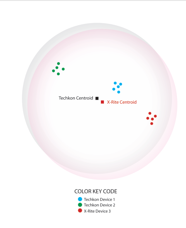 - Intra-Instrument Agreement: A measure of how closely a variety of measurement devices from different manufacturers (such as Xrite and Techkon) agree with each other. An example of this would be measuring with and comparing the Xrite eXact and Techkon SpectroDens. Some slight variation may occur because of differences in device optics, sensor resolution, and centroid. In the diagram below, the centroid and tolerance for the device manufacturer, Xrite, is shown in red.