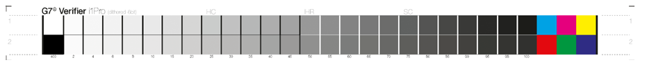 G7 Verifier is a new CMYK target designed for evaluating G7 Grayscale and G7 Targeted compliance levels. Since it contains the minimum patches required for G7 evaluation, it does not replace P2P25 or P2P51 as a calibration target.