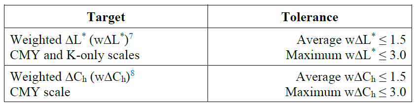 “G7 Colorspace Compliance” is achieved when a device or process passes G7 Targeted Compliance and the CIEL*a*b* values in an IT8.7/4 (or TC1617) target match those in the selected CRPC within the following tolerances.