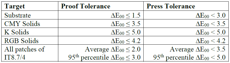Please note, the 95th percentile dE00 for Proof tolerance has been tightened to a 3 instead of 5 from previous version. Also, the primaries (CMYK) and secondary (RGB) reference value can be either absolute value from the Reference Print Condition or revised version with SCCA applied.