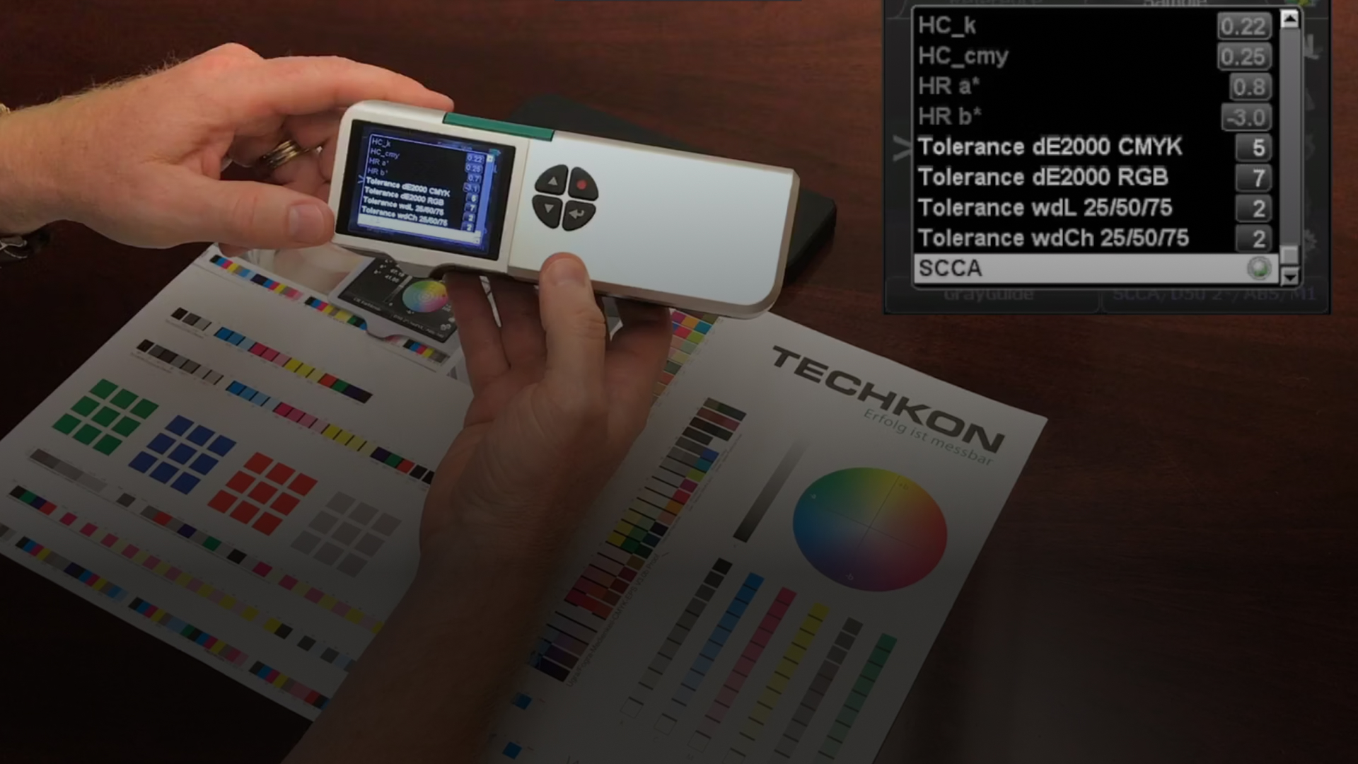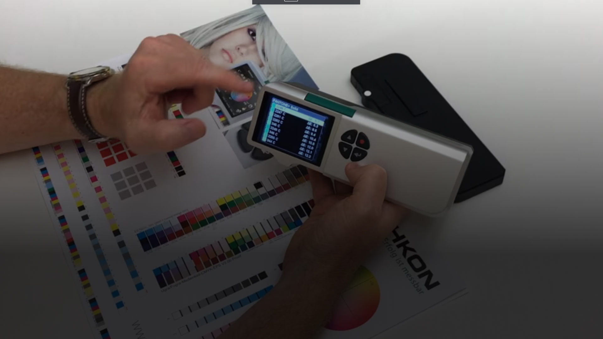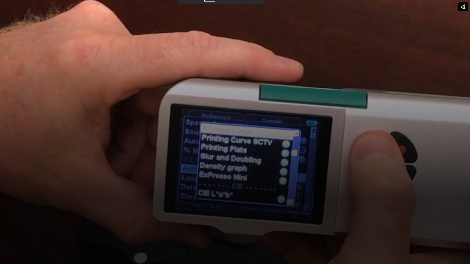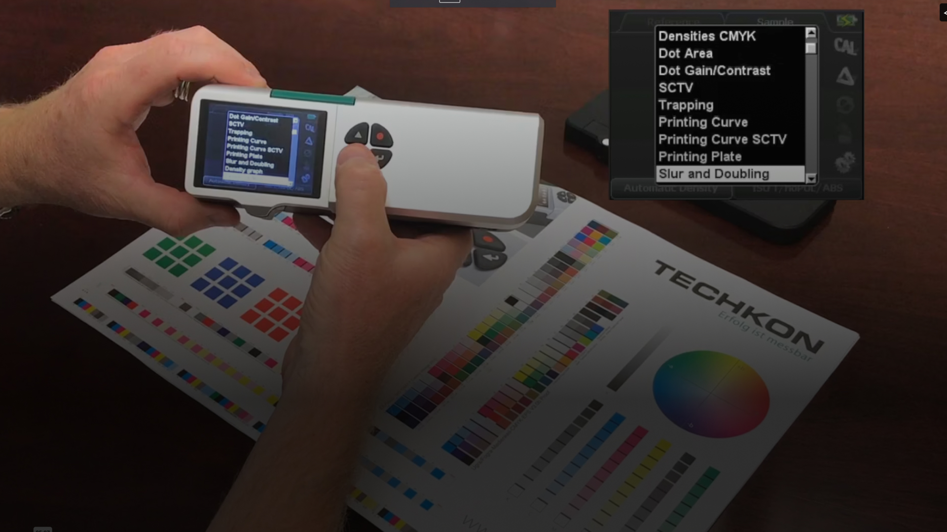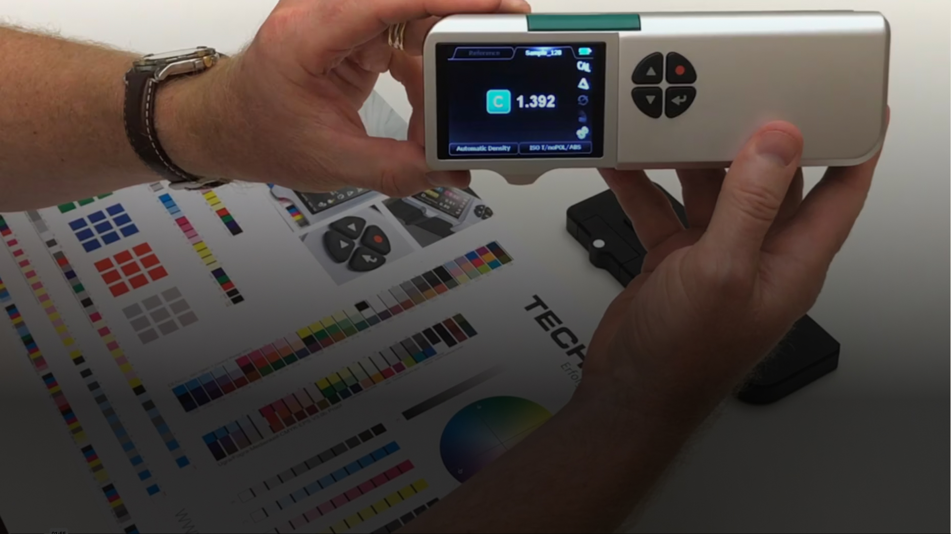 The video demonstrates how the SpectroDens spectrodensitometer automatically recognizes different process colors like Cyan, Magenta, Yellow, and Black, and displays their corresponding density values.