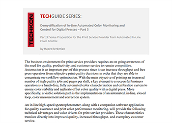 Techkon is committed to providing all of the technical resources necessary for printers and packaging companies worldwide to understand and implement a variety of color measurement solutions. We partner with industry experts to produce the very best in content related to industry standards like G7 and ISO, upcoming trends like expanded gamut, as well as the most up to date information on densitometers, spectrophotometers, closed loop color control, and inline inspection systems.