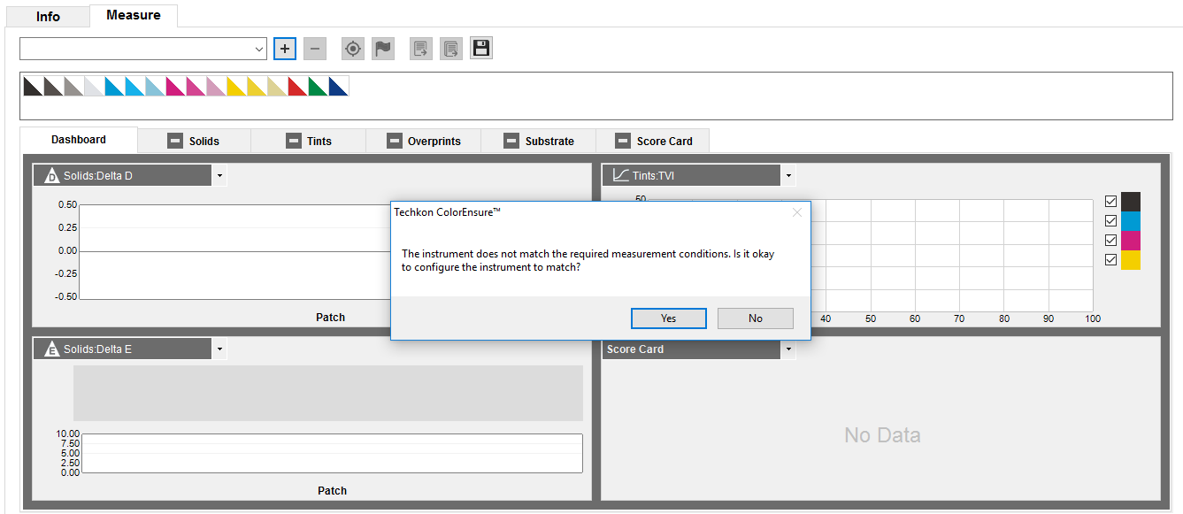 - Here, if the operator clicks “Yes”, the instrument will be automatically configured according to the job specifications. Conversely, if the user clicks “No”, then the measurement sequence is aborted. In this fashion, the ColorEnsure feature takes all of the guess work out of setting up the SpectroDens instrument for accurate color measurements every time.